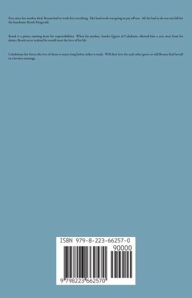 Ever since her mother died, Bryana had to work for everything. Her hard work was going to pay off too. All she had to do was not fall for the handsome Roark Fitzgerald. Roark is a prince running from his responsibilities. When his mother, Amelia Queen of Caladonia, allowed him a year away from his duties; Roark never realized he would meet the love of his life. Caladonian law forces the two of them to marry long before either is ready. Will their love for each other grow, or will Bryana find herself in a loveless marriage.