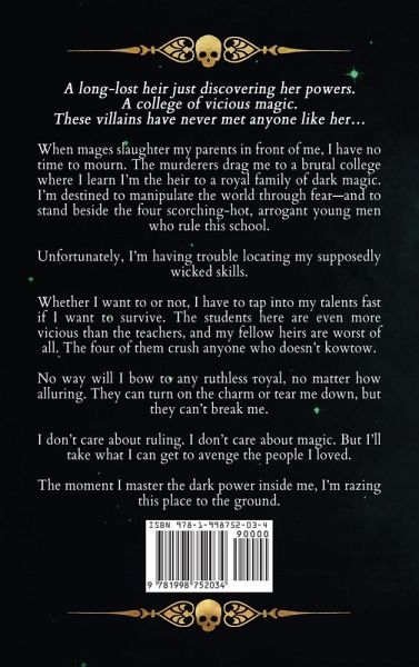 A long-lost heir just discovering her powers. A college of vicious magic. These villains have never met anyone like her... When mages slaughter my parents in front of me, I have no time to mourn. The murderers drag me to a brutal college where I learn I'm the heir to a royal family of dark magic. I'm destined to manipulate the world through fear-and to stand beside the four scorching-hot, arrogant young men who rule this school. Unfortunately, I'm having trouble locating my supposedly wicked skills. Whether I want to or not, I have to tap into my talents fast if I want to survive. The students here are even more vicious than the teachers, and my fellow heirs are worst of all. The four of them crush anyone who doesn't kowtow. No way will I bow to any ruthless royal, no matter how alluring. They can turn on the charm or tear me down, but they can't break me. I don't care about ruling. I don't care about magic. But I'll take what I can get to avenge the people I loved. The moment I master the dark power inside me, I'm razing this place to the ground. *Royals of Villain Academy is a university-age paranormal academy series. Expect magical villainy, a tough heroine who bends to no one's will, a dollop of steam, and a heart-wrenching enemies-to-lovers romance.* This hardcover collection contains the first four books in the Royals of Villain Academy series-Cruel Magic, Vile Sorcery, Sinister Wizardry, and Horrid Charms-plus 30+ pages of exclusive bonus scenes.