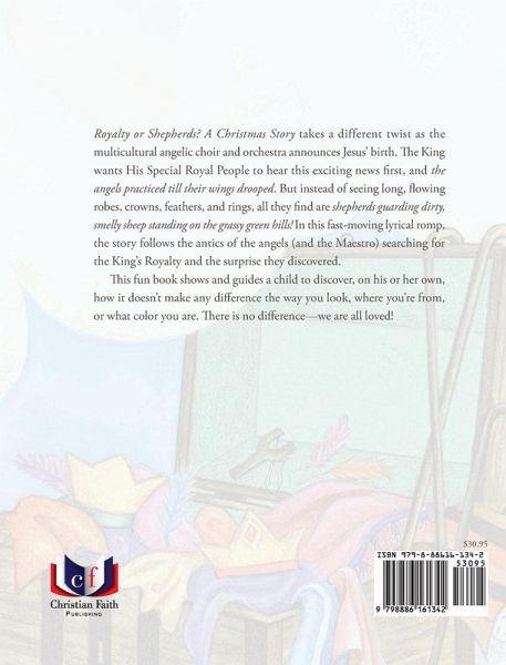 Royalty or Shepherds? A Christmas Story takes a different twist as the multicultural angelic choir and orchestra announces Jesus' birth. The King wants His Special Royal People to hear this exciting news first, and the angels practiced till their wings drooped. But instead of seeing long, flowing robes, crowns, feathers, and rings, all they find are shepherds guarding dirty, smelly sheep standing on the grassy green hills! In this fast-moving lyrical romp, the story follows the antics of the angels (and the Maestro) searching for the King's Royalty and the surprise they discovered. This fun book shows and guides a child to discover, on his or her own, how it doesn't make any difference the way you look, where you're from, or what color you are. There is no difference--we are all loved!