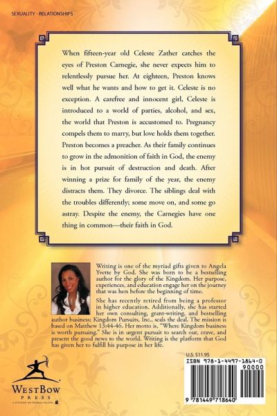 When fifteen-year old Celeste Zather catches the eyes of Preston Carnegie, she never expects him to relentlessly pursue her. At eighteen, Preston knows well what he wants and how to get it. Celeste is no exception. A carefree and innocent girl, Celeste is introduced to a world of parties, alcohol, and sex, the world that Preston is accustomed to. Pregnancy compels them to marry, but love holds them together. Preston becomes a preacher. As their family continues to grow in the admonition of faith in God, the enemy is in hot pursuit of destruction and death. After winning a prize for family of the year, the enemy distracts them. They divorce. The siblings deal with the troubles differently; some move on, and some go astray. Despite the enemy, the Carnegies have one thing in common-their faith in God.
