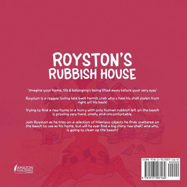 "Imagine your home, life & belonging's being lifted away before your very eyes" Royston is a reggae loving laid back hermit crab who's had his shell stolen fromright off his back! Trying to find a new home in a hurry with only human rubbish left on the beachis proving very hard, smelly and uncomfortable. Join Royston as he tries on a selection of hilarious objects he finds scattered onthe beach to use as his home, but will he ever find a big shiny new shell? and who,is going to clean up the beach?