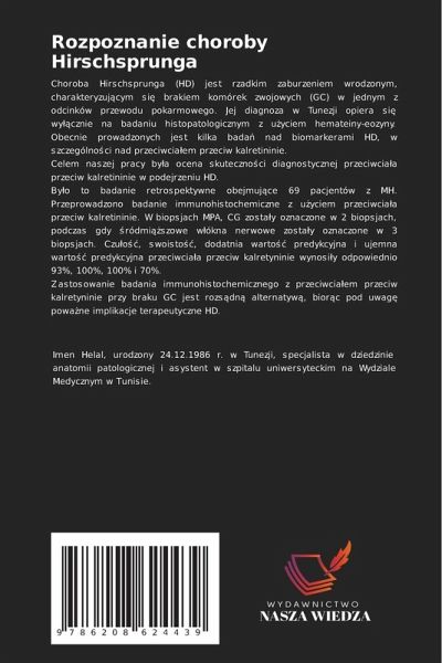Choroba Hirschsprunga (HD) jest rzadkim zaburzeniem wrodzonym, charakteryzuj¿cym si¿ brakiem komórek zwojowych (GC) w jednym z odcinków przewodu pokarmowego. Jej diagnoza w Tunezji opiera si¿ wy¿¿cznie na badaniu histopatologicznym z u¿yciem hemateiny-eozyny. Obecnie prowadzonych jest kilka badä nad biomarkerami HD, w szczególno¿ci nad przeciwciäem przeciw kalretininie. Celem naszej pracy by¿a ocena skuteczno¿ci diagnostycznej przeciwciäa przeciw kalretininie w podejrzeniu HD. By¿o to badanie retrospektywne obejmuj¿ce 69 pacjentów z MH. Przeprowadzono badanie immunohistochemiczne z u¿yciem przeciwciäa przeciw kalretininie. W biopsjach MPA, CG zostäy oznaczone w 2 biopsjach, podczas gdy ¿ródmi¿¿szowe w¿ókna nerwowe zostäy oznaczone w 3 biopsjach. Czu¿o¿¿, swoisto¿¿, dodatnia warto¿¿ predykcyjna i ujemna warto¿¿ predykcyjna przeciwciäa przeciw kalretyninie wynosi¿y odpowiednio 93%, 100%, 100% i 70%.Zastosowanie badania immunohistochemicznego z przeciwciäem przeciw kalretyninie przy braku GC jest rozs¿dn¿ alternatyw¿, bior¿c pod uwag¿ powäne implikacje terapeutyczne HD.