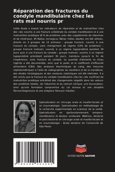 Cette étude a évalué les indicateurs de réparation et de malnutrition chez des rats soumis à une fracture unilatérale du condyle mandibulaire et à une malnutrition protéique (8 % de protéines avec des suppléments de vitamines et de minéraux). 45 Rattus norvegicus Wistar mâles adultes ont été utilisés, divisés en 3 groupes de 15 animaux : groupe fracturé, soumis à une fracture du condyle, sans changement de régime (23% de protéines) ; groupe fracturé malnutri, soumis à un régime hypoprotéiné pendant 30 jours puis à une fracture du condyle ; groupe malnutri, soumis à un régime hypoprotéiné précédent pendant 30 jours, maintenu jusqu'à la fin de l'expérience, sans fracture du condyle. La quantité d'aliments et d'eau ingérée a été documentée, ainsi que le poids et le coefficient d'efficacité alimentaire (CEA). Des analyses biochimiques du sang, des mesures céphalométriques à l'aide de radiographies du maxillaire et de la mandibule, des études histologiques et des analyses statistiques ont été réalisées. Il a été conclu que la fracture du condyle mandibulaire chez les rats souffrant de malnutrition protéique entraînait des changements négatifs dans les valeurs des protéines totales, de l'albumine et du calcium sérique, une leucocytose, ainsi qu'une formation compromise du cal osseux et une atrophie fibrocartilagineuse et une ankylose fibreuse induites.
