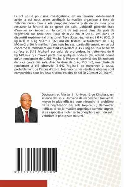 Le sol utilisé pour nos investigations, est un ferralsol, extrêmement acide, à qui nous avons appliqués la matière organique à base de Tithonia diversifolia a été proposée comme piste de solution pour restaurer la fertilité de ce genre des sols. L'objectif générale était d'évaluer son impact sur la culture de soja semé dans des pots de végétation sur deux sols, issus de 0-20 cm et 20-40 cm dans un dispositif expérimental bifactoriel. Trois doses, équivalant à 0 kg (D0), 3 kg (D1) et 6 kg MO.m-2 (D2) ont été testées. Le traitement de 3 kg MO.m-2 a été le meilleur dans tous les cas, particulièrement, en ce qui concerne le rendement qui était équivalant à 3,72 Mg.ha-1sur le sol de surface et 3,48 Mg.ha-1 sur celui de profondeur. le traitement de 0 kg MO.m-2 qui n'avait porté que quelques nodules (8), n'avait donné qu'un rendement de 0,486 Mg.ha-1. Preuve d'inactivité des Rhizobiums dans ce genre des sols. Avec la dose de 6 kg MO.m-2, une chute de rendement a été observée (1,642 Mg.ha-1 de moyenne) à cause, probablement de l'excès d'azote. Néanmoins, les résultats obtenus sont comparables pour les deux niveaux étudiés de sol (0-20cm et 20-40cm).