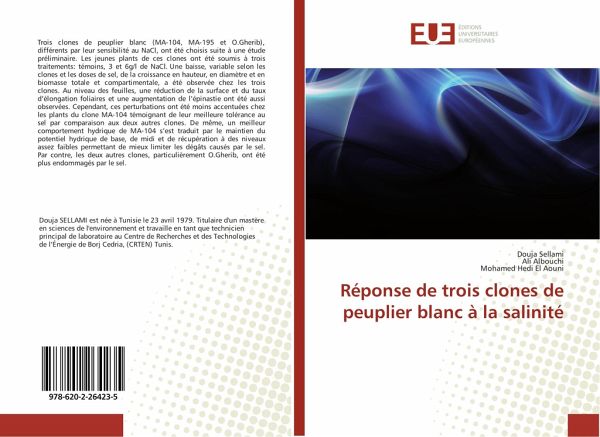 Trois clones de peuplier blanc (MA-104, MA-195 et O.Gherib), différents par leur sensibilité au NaCl, ont été choisis suite à une étude préliminaire. Les jeunes plants de ces clones ont été soumis à trois traitements: témoins, 3 et 6g/l de NaCl. Une baisse, variable selon les clones et les doses de sel, de la croissance en hauteur, en diamètre et en biomasse totale et compartimentale, a été observée chez les trois clones. Au niveau des feuilles, une réduction de la surface et du taux d'élongation foliaires et une augmentation de l'épinastie ont été aussi observées. Cependant, ces perturbations ont été moins accentuées chez les plants du clone MA-104 témoignant de leur meilleure tolérance au sel par comparaison aux deux autres clones. De même, un meilleur comportement hydrique de MA-104 s'est traduit par le maintien du potentiel hydrique de base, de midi et de récupération à des niveaux assez faibles permettant de mieux limiter les dégâts causés par le sel. Par contre, les deux autres clones, particulièrement O.Gherib, ont été plus endommagés par le sel.