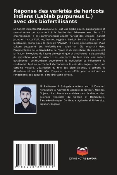 Le haricot indien(Lablab purpureus L.) est une herbe douce, buissonnante et semi-dressée qui appartient à la famille des Fabaceae avec 2n = 22 chromosomes. Il est communément appelé haricot des champs, haricot jacinthe, haricot Dolichos, haricot égyptien, haricot Bonavist, Sem, etc. et localement connu sous le nom de "Papadi". Il s'agit principalement d'une culture autogame. Les biofertilisants jouent un rôle important dans l'augmentation de la disponibilité de l'azote et du phosphore. Ils augmentent la fixation biologique de l'azote atmosphérique et améliorent la disponibilité du phosphore pour la culture. Les semences traitées avec une culture bactérienne de Rhizobium augmentent la nodulation et influencent le rendement, tout en permettant d'économiser le coût des engrais dans une certaine mesure. L'évaluation du rôle des biofertilisants, y compris le Rhizobium et les PSB, afin d'exploiter leurs effets pour améliorer les rendements des cultures, sera une tâche difficile.