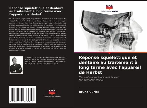 En orthodontie, un problème fréquent est la correction de la malocclusion de classe II. Cela peut être dû à une mandibule qui est positionnée en arrière par rapport au visage. L'une des façons de corriger cette malocclusion est d'utiliser un appareil fonctionnel qui fait avancer la mandibule et améliore ainsi le profil et l'esthétique du visage. L'un des appareils fonctionnels les plus connus aujourd'hui est l'appareil de Herbst (collé aux dents) qui fonctionne en continu. Les effets de la thérapie fonctionnelle étant encore controversés, nous pouvons remarquer que toutes les études utilisant l'appareil de Herbst ont été menées sur une courte période (6 à 8 mois). La durée du traitement pouvant être l'un des principaux paramètres de réussite ou d'échec d'un tel traitement, nous avons décidé de la porter à 20 mois. Les objectifs de notre étude sont donc d'évaluer les changements squelettiques et dentaires survenus dans le maxillaire et la mandibule après 20 mois de traitement à l'aide de radiographies céphalométriques et d'évaluer tout changement du condyle à la fosse glénoïde à la fin du traitement Herbst à l'aide de tomodensitogrammes.