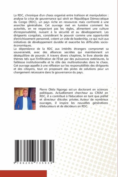 La RDC, chronique d'un chaos organisé entre trahison et manipulation : analyse la crise de gouvernance qui sévit en République Démocratique du Congo (RDC), un pays riche en ressources mais confronté à une anarchie généralisée. Cet ouvrage met en lumière comment les autorités, en ne respectant pas les règles, alimentent une culture d'irresponsabilité, nuisant à la sécurité et au développement. Les dirigeants congolais, considérant le pouvoir comme une opportunité d'enrichissement personnel, créent un vide de leadership, ce qui nuit aux initiatives de développement durable et exacerbe les difficultés socio-économiques.La dépendance de la RDC aux intérêts étrangers compromet sa souveraineté, avec des alliances secrètes qui maintiennent un déséquilibre de pouvoir. À travers divers chapitres, le livre aborde des thèmes tels que l'infiltration de l'État par des puissances extérieures, la faiblesse institutionnelle et le rôle des multinationales dans le chaos. Cet ouvrage appelle à une réflexion sur les responsabilités des dirigeants et des citoyens, tout en proposant des pistes de solutions pour un changement nécessaire dans la gouvernance du pays.