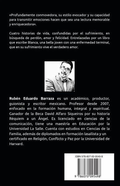 Profundamente conmovedora, su estilo evocador y su capacidad para transmitir emociones hacen que sea una lectura memorable y enriquecedora. Cuatro historias de vida, confundidas por el sufrimiento, en búsqueda de perdón, amor y felicidad. Entrelazadas por un libro que escribe Blanca, una bella joven con una enfermedad terminal, que en su sufrimiento vive el verdadero amor.