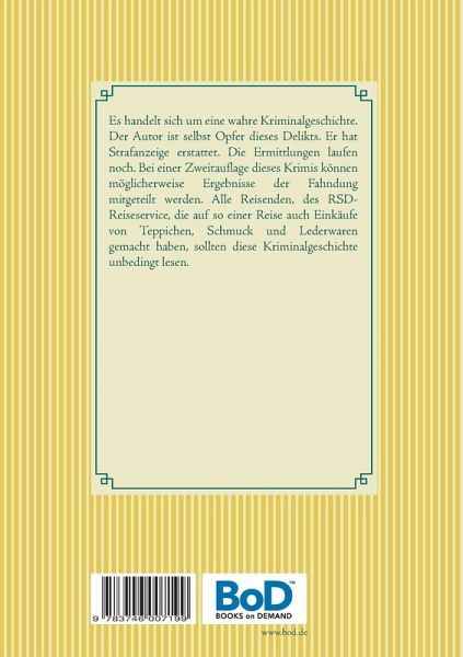 Es handelt sich um eine wahre Kriminalgeschichte. Der Autor ist selbst Opfer dieses Delikts. Er hat Strafanzeige erstattet. Die Ermittlungen laufen noch. Bei einer Zweitauflage dieses Krimis können möglicherweise Ergebnisse der Fahndung mitgeteilt werden. Alle Reisenden, des RSD-Reiseservice, die auf so einer Reise auch Einkäufe von Teppichen, Schmuck und Lederwaren gemacht haben, sollten diese Kriminalgeschichte unbedingt lesen.