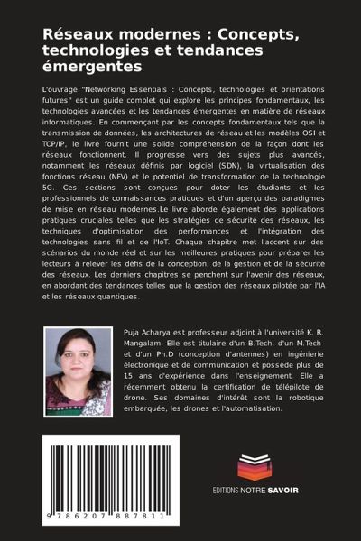L'ouvrage "Networking Essentials : Concepts, technologies et orientations futures" est un guide complet qui explore les principes fondamentaux, les technologies avancées et les tendances émergentes en matière de réseaux informatiques. En commençant par les concepts fondamentaux tels que la transmission de données, les architectures de réseau et les modèles OSI et TCP/IP, le livre fournit une solide compréhension de la façon dont les réseaux fonctionnent. Il progresse vers des sujets plus avancés, notamment les réseaux définis par logiciel (SDN), la virtualisation des fonctions réseau (NFV) et le potentiel de transformation de la technologie 5G. Ces sections sont conçues pour doter les étudiants et les professionnels de connaissances pratiques et d'un aperçu des paradigmes de mise en réseau modernes.Le livre aborde également des applications pratiques cruciales telles que les stratégies de sécurité des réseaux, les techniques d'optimisation des performances et l'intégration des technologies sans fil et de l'IoT. Chaque chapitre met l'accent sur des scénarios du monde réel et sur les meilleures pratiques pour préparer les lecteurs à relever les défis de la conception, de la gestion et de la sécurité des réseaux. Les derniers chapitres se penchent sur l'avenir des réseaux, en abordant des tendances telles que la gestion des réseaux pilotée par l'IA et les réseaux quantiques.