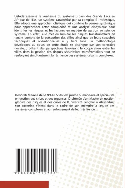 L'étude examine la résilience du système urbain des Grands Lacs en Afrique de l'Est, un système caractérisé par sa complexité intrinsèque. Elle adopte une approche holistique qui combine la pensée systémique pour appréhender cette complexité et une analyse cindynique pour identifier les risques et les lacunes en matière de gestion au sein du système. En effet, elle met en lumière les risques transfrontaliers en tenant compte de la perception des villes ainsi que de leurs capacités techniques et opérationnelles à y faire face. La méthodologie développée au cours de cette étude se distingue par son caractère novateur, offrant des perspectives favorisant la coopération entre les villes dans la gestion des risques sécuritaires transfrontaliers tout en renforçant simultanément la résilience des systèmes urbains complexes.
