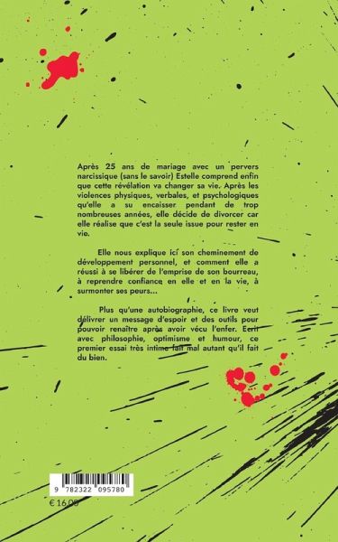 Après 25 ans de mariage avec un pervers narcissique (sans le savoir) Estelle comprend enfin que cette révélation va changer sa vie. Après les violences physiques, verbales, et psychologiques qu'elle a su encaisser pendant de trop nombreuses années, elle décide de divorcer car elle réalise que c'est la seule issue pour rester en vie. Elle nous explique ici son cheminement de développement personnel, et comment elle a réussi à se libérer de l'emprise de son bourreau, à reprendre confiance en elle et en la vie, à surmonter ses peurs... Plus qu'une autobiographie, ce livre veut délivrer un message d'espoir et des outils pour pouvoir renaître après avoir vécu l'enfer. Ecrit avec philosophie, optimisme et humour, ce premier essai très intime fait mal autant qu'il fait du bien.