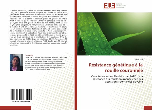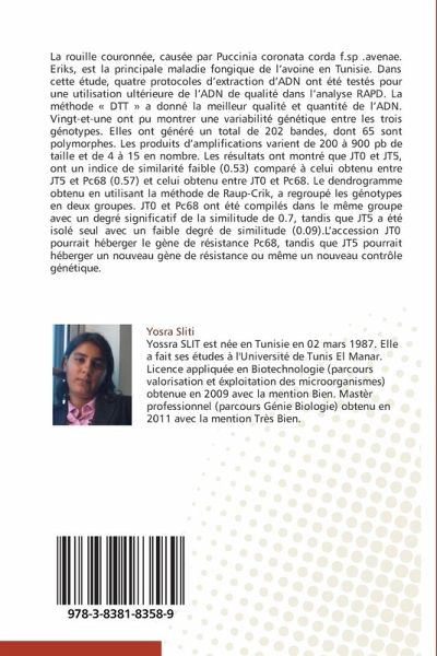 La rouille couronnée, causée par Puccinia coronata corda f.sp .avenae. Eriks, est la principale maladie fongique de l'avoine en Tunisie. Dans cette étude, quatre protocoles d'extraction d'ADN ont été testés pour une utilisation ultérieure de l'ADN de qualité dans l'analyse RAPD. La méthode « DTT » a donné la meilleur qualité et quantité de l'ADN. Vingt-et-une ont pu montrer une variabilité génétique entre les trois génotypes. Elles ont généré un total de 202 bandes, dont 65 sont polymorphes. Les produits d'amplifications varient de 200 à 900 pb de taille et de 4 à 15 en nombre. Les résultats ont montré que JT0 et JT5, ont un indice de similarité faible (0.53) comparé à celui obtenu entre JT5 et Pc68 (0.57) et celui obtenu entre JT0 et Pc68. Le dendrogramme obtenu en utilisant la méthode de Raup-Crik, a regroupé les génotypes en deux groupes. JT0 et Pc68 ont été compilés dans le même groupe avec un degré significatif de la similitude de 0.7, tandis que JT5 a été isolé seul avec un faible degré de similitude (0.09).L'accession JT0 pourrait héberger le gène de résistance Pc68, tandis que JT5 pourrait héberger un nouveau gène de résistance ou même un nouveau contrôle génétique.