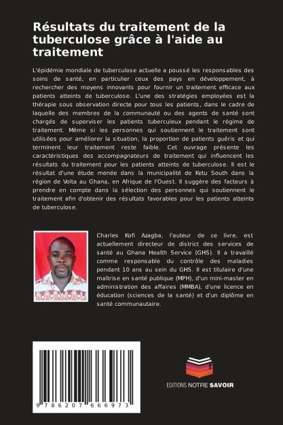 L'épidémie mondiale de tuberculose actuelle a poussé les responsables des soins de santé, en particulier ceux des pays en développement, à rechercher des moyens innovants pour fournir un traitement efficace aux patients atteints de tuberculose. L'une des stratégies employées est la thérapie sous observation directe pour tous les patients, dans le cadre de laquelle des membres de la communauté ou des agents de santé sont chargés de superviser les patients tuberculeux pendant le régime de traitement. Même si les personnes qui soutiennent le traitement sont utilisées pour améliorer la situation, la proportion de patients guéris et qui terminent leur traitement reste faible. Cet ouvrage présente les caractéristiques des accompagnateurs de traitement qui influencent les résultats du traitement pour les patients atteints de tuberculose. Il est le résultat d'une étude menée dans la municipalité de Ketu South dans la région de Volta au Ghana, en Afrique de l'Ouest. Il suggère des facteurs à prendre en compte dans la sélection des personnes qui soutiennent le traitement afin d'obtenir des résultats favorables pour les patients atteints de tuberculose.
