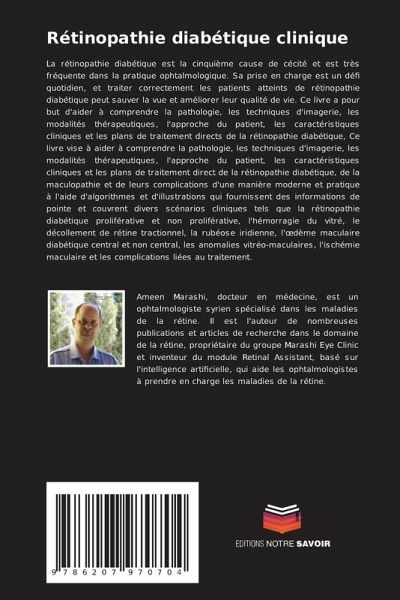 La rétinopathie diabétique est la cinquième cause de cécité et est très fréquente dans la pratique ophtalmologique. Sa prise en charge est un défi quotidien, et traiter correctement les patients atteints de rétinopathie diabétique peut sauver la vue et améliorer leur qualité de vie. Ce livre a pour but d'aider à comprendre la pathologie, les techniques d'imagerie, les modalités thérapeutiques, l'approche du patient, les caractéristiques cliniques et les plans de traitement directs de la rétinopathie diabétique, Ce livre vise à aider à comprendre la pathologie, les techniques d'imagerie, les modalités thérapeutiques, l'approche du patient, les caractéristiques cliniques et les plans de traitement direct de la rétinopathie diabétique, de la maculopathie et de leurs complications d'une manière moderne et pratique à l'aide d'algorithmes et d'illustrations qui fournissent des informations de pointe et couvrent divers scénarios cliniques tels que la rétinopathie diabétique proliférative et non proliférative, l'hémorragie du vitré, le décollement de rétine tractionnel, la rubéose iridienne, l'oedème maculaire diabétique central et non central, les anomalies vitréo-maculaires, l'ischémie maculaire et les complications liées au traitement.