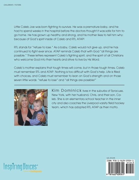 Little Caleb Joe was born fighting to survive. He was a premature baby, and he had to spend weeks in the hospital before the doctors thought it was safe for him to go home. He has grown up healthy and strong, and his mother likes to tell him why: because of God's spirit inside of Caleb and RTL ATAP! RTL stands for "refuse to lose." As a baby, Caleb would not give up, and he has continued to fight ever since. ATAP reminds Caleb that with God "all things are possible." These letters represent Caleb's fighting spirit, and the spirit of all Christians who welcome God into their hearts and strive to live by His Word. Caleb's mother explains that tough times will come, but in those tough times, Caleb must remember RTL and ATAP. Nothing is too difficult with God's help. Life is filled with choices, and Caleb must remember to lean on God's strength and on those seven little words: "refuse to lose" and "all things are possible!"