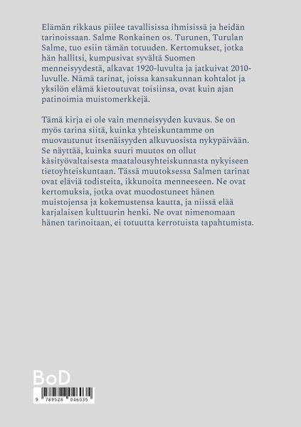 Elämän rikkaus piilee tavallisissa ihmisissä ja heidän tarinoissaan. Salme Ronkainen os. Turunen, Turulan Salme, tuo esiin tämän totuuden. Kertomukset, jotka hän hallitsi, kumpusivat syvältä Suomen menneisyydestä, alkavat 1920-luvulta ja jatkuivat 2010-luvulle. Nämä tarinat, joissa kansakunnan kohtalot ja yksilön elämä kietoutuvat toisiinsa, ovat kuin ajan patinoimia muistomerkkejä. Tämä kirja ei ole vain menneisyyden kuvaus. Se on myös tarina siitä, kuinka yhteiskuntamme on muovautunut itsenäisyyden alkuvuosista nykypäivään. Se näyttää, kuinka suuri muutos on ollut käsityövaltaisesta maatalousyhteiskunnasta nykyiseen tietoyhteiskuntaan. Tässä muutoksessa Salmen tarinat ovat eläviä todisteita, ikkunoita menneeseen. Ne ovat kertomuksia, jotka ovat muodostuneet hänen muistojensa ja kokemustensa kautta, ja niissä elää karjalaisen kulttuurin henki. Ne ovat nimenomaan hänen tarinoitaan, ei totuutta kerrotuista tapahtumista. Kirjassa on kaksi kertojaääntä: Turulan Salme itse ja kaikki tietävä kertoja, jonka ajankuvauksella tarinat asetetaan laajempaan yhteiskunnalliseen kokonaisuuteen. Kirjassa on 320 sivua ja 50 valokuvaa.