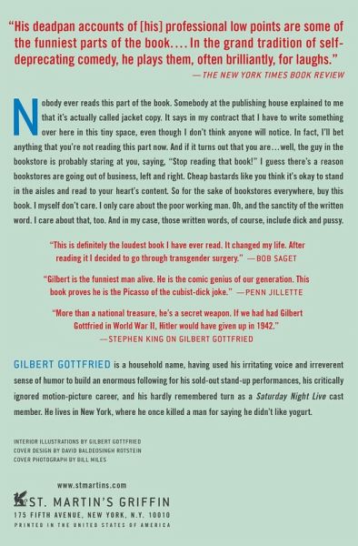 Gilbert Gottfried on Rubber Balls and Liquor: Nobody ever reads this part of the book. Somebody at the publishing house explained to me that it's actually called jacket copy. It says in my contract that I have to write something over here in this tiny space, even though I don't think anyone will notice. In fact, I'll bet anything that you're not reading this part now. And if it turns out that you are . . . well, the guy in the bookstore is probably staring at you, saying, "Stop reading that book!" I guess there's a reason bookstores are going out of business, left and right. Cheap bastards like you think it's okay to stand in the aisles and read to your heart's content. So for the sake of bookstores everywhere, buy this book. I myself don't care. I only care about the poor working man. Oh, and the sanctity of the written word. I care about that, too. And in my case, those written words, of course, include dick and pussy.