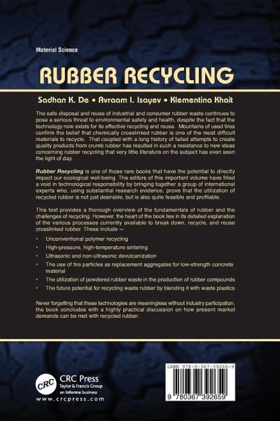 Written by worldwide experts, this book offers comprehensive coverage of the latest technologies for recycled rubber. It covers the fundamentals of rubber, rubber products, and recycling; explores properties of rubber, rubber reuse, and reuse specifications; and examines new applications and processes for recycling rubber. Responding to the continuing search for easier, cheaper, and more innovative methods and technologies, the book discusses unconventional polymer recycling, powdered rubber waste applications, and the blending recycling waste rubber with waste plastics. It also discusses how present market demands can be met with recycled rubber.