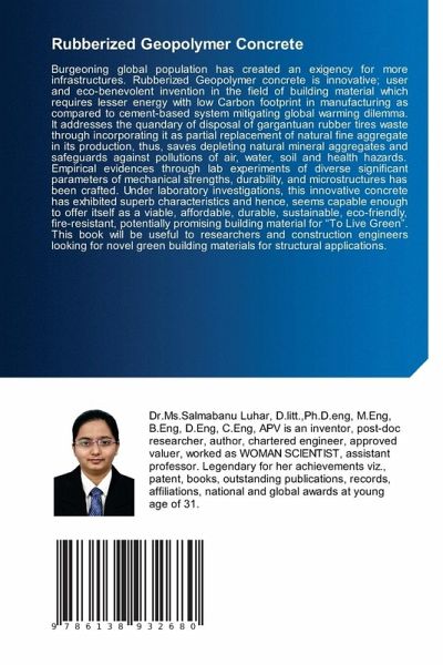 Burgeoning global population has created an exigency for more infrastructures. Rubberized Geopolymer concrete is innovative; user and eco-benevolent invention in the field of building material which requires lesser energy with low Carbon footprint in manufacturing as compared to cement-based system mitigating global warming dilemma. It addresses the quandary of disposal of gargantuan rubber tires waste through incorporating it as partial replacement of natural fine aggregate in its production, thus, saves depleting natural mineral aggregates and safeguards against pollutions of air, water, soil and health hazards. Empirical evidences through lab experiments of diverse significant parameters of mechanical strengths, durability, and microstructures has been crafted. Under laboratory investigations, this innovative concrete has exhibited superb characteristics and hence, seems capable enough to offer itself as a viable, affordable, durable, sustainable, eco-friendly, fire-resistant,potentially promising building material for "To Live Green". This book will be useful to researchers and construction engineers looking for novel green building materials for structural applications.
