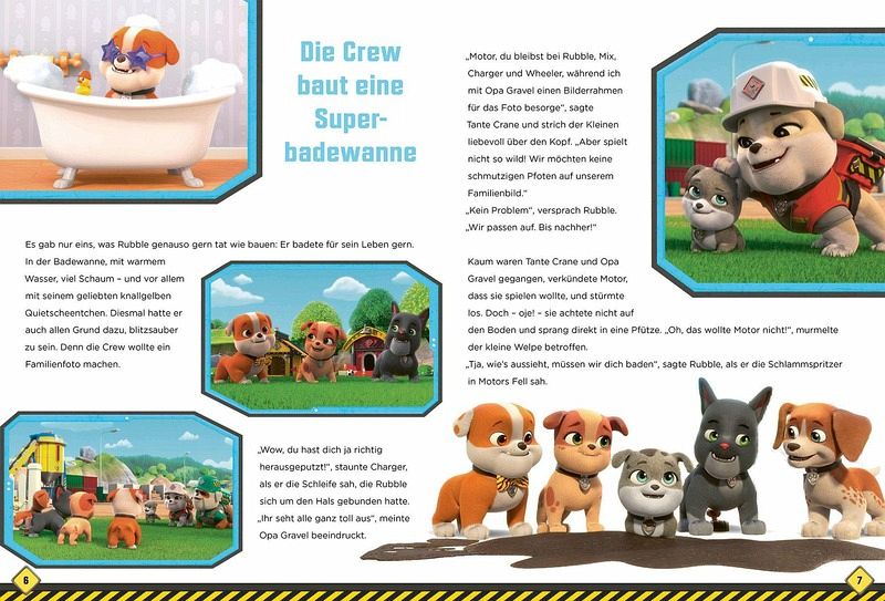 Was soll man mit einem Hundewelpen machen, der nicht baden will? Ganz einfach: Rubble und seine Bau-Hunde bauen ihm eine ganz besondere Badewanne - mit viel Schaum und bunten Blubberblasen drin. Auch für Schweinchen Trüffel, das sich in seinem neuen Stall nicht wohlfühlt, finden sie eine baupfotenstarke Lösung. Und am Ende gelingt es der Crew sogar, Charger mit einer coolen Dino-Geburtstagsparty zu überraschen ... Drei bautastische Abenteuer mit Rubble und seiner Crew!
