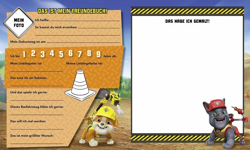 In diesem baupfotenstarken Album können sich alle deine Freunde mit kleinen Einträgen und einem selbst gemalten Bild verewigen. Außerdem erfährst du hier das ein oder andere Geheimnis von Rubble und seiner Bauhund-Familie. Mit Fotoseite und Geburtstagskalender!