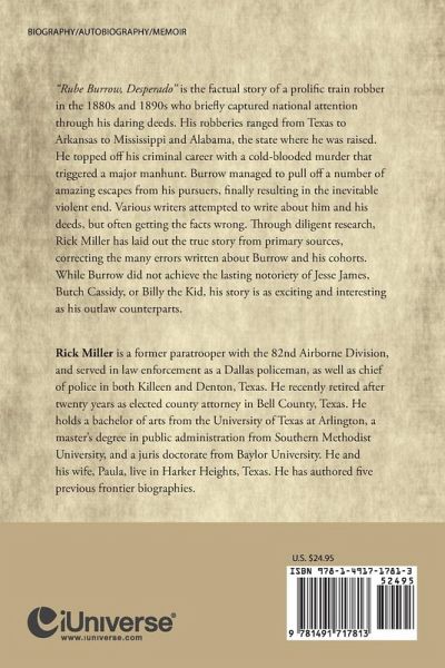 "Rube Burrow, Desperado" is the factual story of a prolific train robber in the 1880s and 1890s who briefly captured national attention through his daring deeds. His robberies ranged from Texas to Arkansas to Mississippi and Alabama, the state where he was raised. He topped off his criminal career with a cold-blooded murder that triggered a major manhunt. Burrow managed to pull off a number of amazing escapes from his pursuers, finally resulting in the inevitable violent end. Various writers attempted to write about him and his deeds, but often getting the facts wrong. Through diligent research, Rick Miller has laid out the true story from primary sources, correcting the many errors written about Burrow and his cohorts. While Burrow did not achieve the lasting notoriety of Jesse James, Butch Cassidy, or Billy the Kid, his story is as exciting and interesting as his outlaw counterparts.