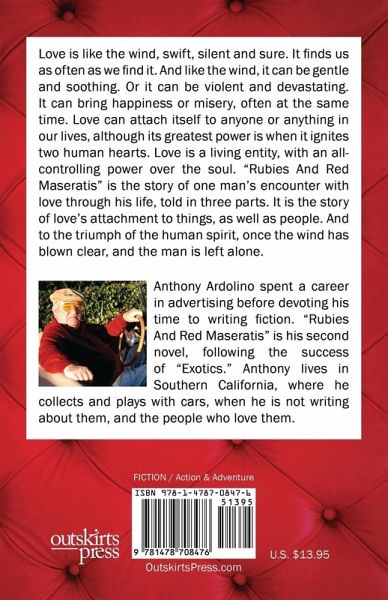 Love is like the wind, swift, silent and sure. It finds us as often as we find it. And like the wind, it can be gentle and soothing. Or it can be violent and devastating. It can bring happiness or misery, often at the same time. Love can attach itself to anyone or anything in our lives, although its greatest power is when it ignites two human hearts. Love is a living entity, with an all-controlling power over the soul. "Rubies And Red Maseratis" is the story of one man's encounter with love through his life, told in three parts. It is the story of love's attachment to things, as well as people. And to the triumph of the human spirit, once the wind has blown clear, and the man is left alone.