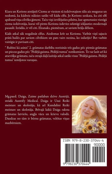 Kiara un Kerions atst¿jui Ciemu ar viesiem t¿ iedz¿votajiem t¿lu aiz muguras un nedom¿, ka k¿dreiz n¿ksies satikt v¿l k¿du elfu. Jo Kerions uzskata, ka citi elfi apdraud vi¿a cilv¿ku ¿imeni. Täu vi¿i izv¿l¿juies pils¿tu, kur apmetusies vien¿g¿ ciema iedz¿vot¿ja, kurai v¿l pirms Keriona izdevies sekm¿gi iek¿auties modernaj¿ pasaul¿. Izr¿d¿s, ir v¿l citi. Elzanaks, piem¿ram, ar saviem br¿¿a d¿liem. K¿ds atkal s¿k nogalin¿t elfus. Aizdomas kr¿t uz Kerionu. Varb¿t vi¿ sajucis pr¿t¿ bail¿s par saviem cilv¿kiem un pats vairs nezina, ko izdar¿jis? Bet varb¿t vain¿gie ir pavisam citi. " Rub¿ni k¿ asinis" 2. gr¿matas darb¿ba norisin¿s tr¿s gadus p¿c pirm¿s gr¿matas un piecus gadus p¿c "P¿d¿j¿ gaisma. P¿d¿j¿ tumsa" notikumiem. To var las¿t ar¿ k¿ atsevi¿u gr¿matu, täu otraj¿ dä¿ las¿t¿js atkal satiks visus "P¿d¿j¿ gaisma. P¿d¿j¿ tumsa" iem¿¿otos varo¿us.