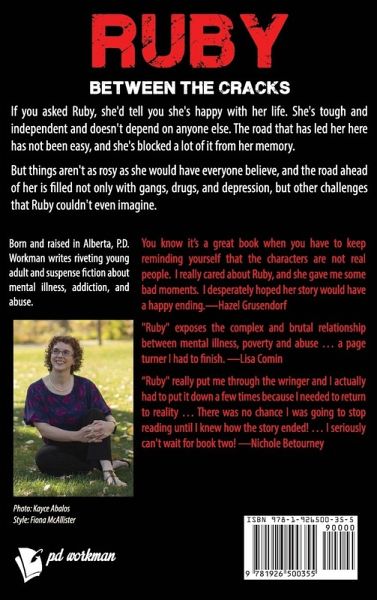 We all have secrets. But at a certain point, they become too big to keep. If you asked Ruby, she'd tell you she's happy with her life. She's tough and independent and doesn't depend on anyone else. The road that has led her here has not been easy, and she's blocked a lot of it from her memory. But things aren't as rosy as she would have everyone believe, and the road ahead of her is filled not only with gangs, drugs, and depression, but other challenges that Ruby hasn't even imagined. Winner of "In The Margins" Top Ten Best Books for Teens Award 2015. Awarded to relevant books for our communities that validate, illuminate and humanize those living in the margins. Praise for Ruby You know it's a great book when you have to keep reminding yourself that the characters are not real people. I really cared about Ruby, and she gave me some bad moments. I desperately hoped her story would have a happy ending. "Ruby" exposes the complex and brutal relationship between mental illness, poverty, and abuse ... a page turner I had to finish "Ruby" really put me through the wringer and I actually had to put it down a few times because I needed to return to reality ... There was no chance I was going to stop reading until I knew how the story ended! ... I seriously can't wait for book two! The Between the Cracks books have been absolutely AMAZING! As soon as I started to read "Ruby", I just had to keep going. I wish I could forget the book Ruby and read it all over again. This book is utterly amazing, I find myself having more empathy for children in these types of situations than ever before. My heart seriously yearns for them. I can't put this book down. Praise for P.D. Workman Every single one of [P.D. Workman's] books has spoken to me in ways no one or almost anything else has. And I have found strength in the books I've read. The way that P.D. Workman writes just flows amazingly and allows the reader to get really invested in a book.
