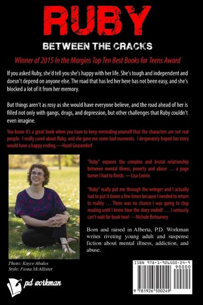 We all have secrets. But at a certain point, they become too big to keep. If you asked Ruby, she'd tell you she's happy with her life. She's tough and independent and doesn't depend on anyone else. The road that has led her here has not been easy, and she's blocked a lot of it from her memory. But things aren't as rosy as she would have everyone believe, and the road ahead of her is filled not only with gangs, drugs, and depression, but other challenges that Ruby hasn't even imagined. Winner of "In The Margins" Top Ten Best Books for Teens Award 2015. Awarded to relevant books for our communities that validate, illuminate and humanize those living in the margins. Praise for Ruby You know it's a great book when you have to keep reminding yourself that the characters are not real people. I really cared about Ruby, and she gave me some bad moments. I desperately hoped her story would have a happy ending. "Ruby" exposes the complex and brutal relationship between mental illness, poverty, and abuse ... a page turner I had to finish "Ruby" really put me through the wringer and I actually had to put it down a few times because I needed to return to reality ... There was no chance I was going to stop reading until I knew how the story ended! ... I seriously can't wait for book two! The Between the Cracks books have been absolutely AMAZING! As soon as I started to read "Ruby", I just had to keep going. I wish I could forget the book Ruby and read it all over again. This book is utterly amazing, I find myself having more empathy for children in these types of situations than ever before. My heart seriously yearns for them. I can't put this book down. Praise for P.D. Workman Every single one of [P.D. Workman's] books has spoken to me in ways no one or almost anything else has. And I have found strength in the books I've read. The way that P.D. Workman writes just flows amazingly and allows the reader to get really invested in a book.