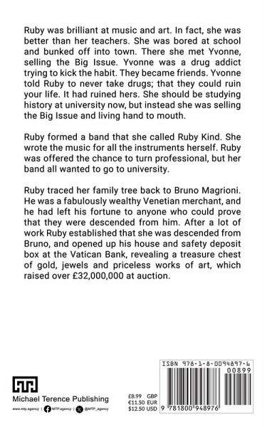 Ruby was brilliant at music and art. In fact, she was better than her teachers. She was bored at school and bunked off into town. There she met Yvonne, selling the Big Issue. Yvonne was a drug addict trying to kick the habit. They became friends. Yvonne told Ruby to never take drugs; that they could ruin your life. It had ruined hers. She should be studying history at university now, but instead she was selling the Big Issue and living hand to mouth. Ruby formed a band that she called Ruby Kind. She wrote the music for all the instruments herself. Ruby was offered the chance to turn professional, but her band all wanted to go to university. Ruby traced her family tree back to Bruno Magrioni. He was a fabulously wealthy Venetian merchant, and he had left his fortune to anyone who could prove that they were descended from him. After a lot of work Ruby established that she was descended from Bruno, and opened up his house and safety deposit box at the Vatican Bank, revealing a treasure chest of gold, jewels and priceless works of art, which raised over £32,000,000 at auction.
