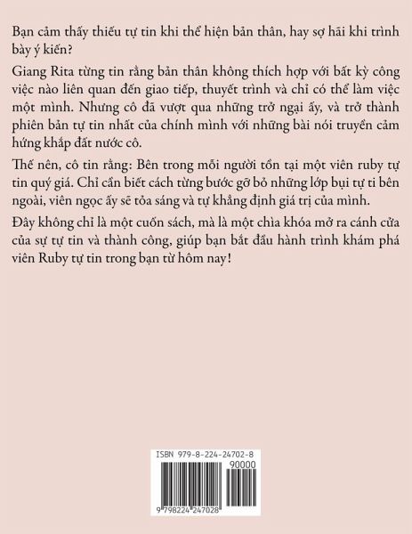 B¿n c¿m th¿y thi¿u t¿ tin khi th¿ hi¿n b¿n thân, hay s¿ hãi khi trình bày ý ki¿n? Giang Rita t¿ng tin r¿ng b¿n thân không thích h¿p v¿i b¿t k¿ công vi¿c nào liên quan ¿¿n giao ti¿p, thuy¿t trình và ch¿ có th¿ làm vi¿c m¿t mình. Nh¿ng cô ¿ã v¿¿t qua nh¿ng tr¿ ng¿i ¿y, và tr¿ thành phiên b¿n t¿ tin nh¿t c¿a chính mình v¿i nh¿ng bài nói truy¿n c¿m h¿ng kh¿p ¿¿t n¿¿c cô. Th¿ nên, cô tin r¿ng: Bên trong m¿i ng¿¿i t¿n t¿i m¿t viên ruby t¿ tin quý giá. Ch¿ c¿n bi¿t cách t¿ng b¿¿c g¿ b¿ nh¿ng l¿p b¿i t¿ ti bên ngoài, viên ng¿c ¿y s¿ t¿a sáng và t¿ kh¿ng ¿¿nh giá tr¿ c¿a mình. ¿ây không ch¿ là m¿t cün sách, mà là m¿t chìa khóa m¿ ra cánh c¿a c¿a s¿ t¿ tin và thành công, giúp b¿n b¿t ¿¿u hành trình khám phá viên Ruby t¿ tin trong b¿n.