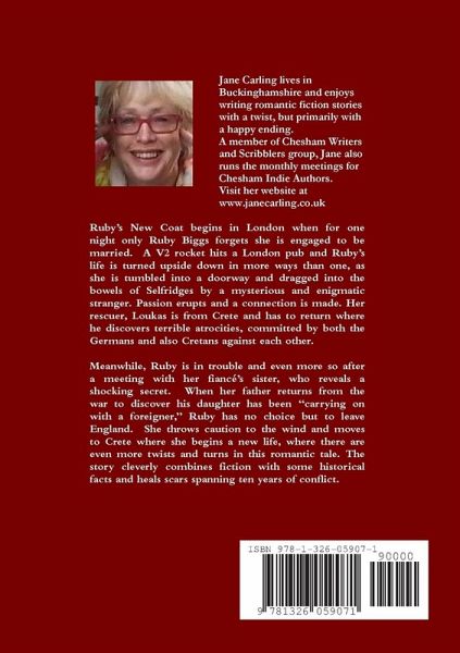 Ruby's New Coat begins in London when, for one night only, Ruby Biggs forgets she is engaged to be married. A V2 rocket hits a London pub and Ruby's life is turned upside down in more ways than one, as she is tumbled into a doorway and dragged into the bowels of Selfridges by a mysterious and enigmatic stranger. Passion erupts and a connection is made. Her rescuer, Loukas, is from Crete and has to return, where he discovers terrible atrocities committed by both the Germans and the Cretans against each other. Meanwhile, Ruby is in trouble, even more so after her fiancé's sister reveals a shocking secret. When her father returns from the war to discover his daughter has been "carrying on with a foreigner," Ruby has no choice but to leave England. She throws caution to the wind and moves to Crete where she begins a new life. Combining fiction with historical fact, this romantic tale has twists and turns and heals scars spanning ten years of conflict.