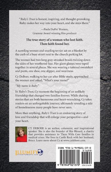 Ruby's Trust is the true story of a woman who lost faith and then faith found her. A scowling woman and snarling terrier sat on a blanket by the curb of a busy street next to the church parking lot. The woman had two long gray-streaked braids twining down the sides of her weathered face. Her giant glasses were taped together in several places. She was wearing a tattered sweatshirt and pants, one shoe, one slipper, and weariness. Cy DeBoer, walking to her car after Bible study, approached the woman and asked, "What's your name?" "My name is Ruby." In Ruby's Trust, Cy recounts the beginning of an unlikely friendship that changed two families forever. While sharing stories that are both humorous and heart-wrenching, Cy takes readers on an unforgettable journey, ultimately revealing a side of homelessness many people have never seen. More than anything, Ruby's Trust is an endearing story of love and friendship that will enlarge your perspective—and your heart.