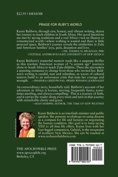 Karen Baldwin's masterful memoir reads like a suspense thriller as this resolute American woman of "a certain age" journeys alone to South Africa to teach Zulu children. There she encounters a stunning resistance to change from those who invited her. Baldwin's writing is candid, taut and relentless, as waves of cultural tension build to an unforeseen crisis that tests her courage and strength. -Phaedra Greenwood, Award Winning Journalist Karen Baldwin, through raw, honest, and vibrant writing, shares her journey to teach children in South Africa. Her good intentions are met by strong traditions and a real Africa-not an illusion or romanticized world-where nothing is wasted and there is little personal space. Baldwin's journey reveals the similarities in Zulu and American families' joys, pain, deception and love. -Dr. Andrea M. Heckman, PhD, Cultural Anthropologist, University of New Mexico An extraordinary story, beautifully told. Baldwin's account of her adventure in Africa is honest, moving, frequently funny, sometimes startling, and always compelling. This is a journey of faith, and it carries the reader along every twist and turn in that journey with remarkable clarity and grace. -Sean Murphy, Author, The Time of New Weather