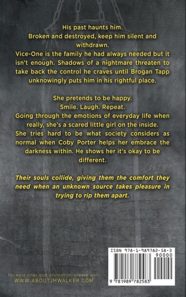 Warning: This book deals with some darker subjects. If you have any triggers at all, please read with caution but know that there is always light within the darkness. "An unexpected evil brings both the MC and Military world together in this brand new series by J.M. Walker" His past haunts him. Broken and destroyed, keep him silent and withdrawn. Vice-One is the family he had always needed but it isn't enough. Shadows of a nightmare threaten to take back the control he craves until Brogan Tapp unknowingly puts him in his rightful place. She pretends to be happy. Smile. Laugh. Repeat. Going through the emotions of everyday life when really, she's a scared little girl on the inside. She tries hard to be what society considers as normal when Coby Porter helps her embrace the darkness within. He shows her it's okay to be different. Their souls collide, giving them the comfort they need when an unknown source takes pleasure in trying to rip them apart. *Can be read as a standalone*