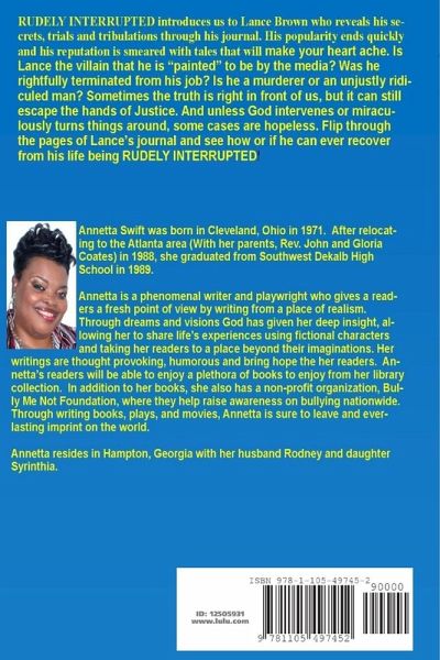 RUDELY INTERRUPTED introduces us to Lance Brown who reveals his secrets, trials and tribulations through his journal. His popularity ends quickly and his reputation is smeared with tales that will make your heart ache. Is Lance the villain that he is "painted" to be by the media? Was he rightfully terminated from his job? Is he a murderer or an unjustly ridiculed man? Sometimes the truth is right in front of us, but it can still escape the hands of Justice. And unless God intervenes or miraculously turns things around, some cases are hopeless. Flip through the pages of Lance's journal and see how or if he can ever recover from his life being RUDELY INTERRUPTED!