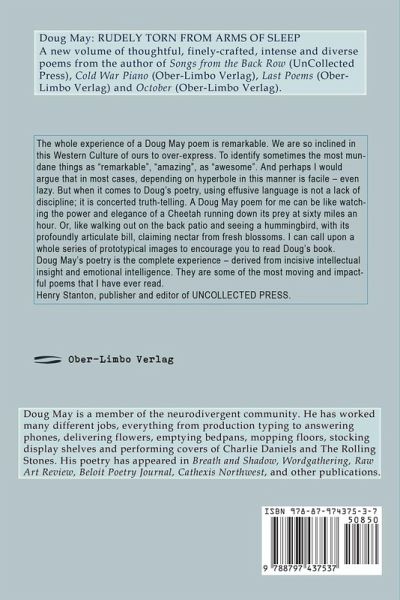 A new volume of thoughtful, finely-crafted, intense and diverse poems from the author of Songs from the Back Row (UnCollected Press), Cold War Piano (Ober-Limbo Verlag), Last Poems (Ober-Limbo Verlag) and October (Ober- Limbo Verlag). "The whole experience of a Doug May poem is remarkable. We are so inclined in this Western Culture of ours to over-express. To identify sometimes the most mundane things as "remarkable", "amazing", as "awesome". And perhaps I would argue that in most cases, depending on hyperbole in this manner is facile - even lazy. But when it comes to Doug's poetry, using effusive language is not a lack of discipline; it is concerted truth-telling. A Doug May poem for me can be like watching the power and elegance of a Cheetah running down its prey at sixty miles an hour. Or, like walking out on the back patio and seeing a hummingbird, with its profoundly articulate bill, claiming nectar from fresh blossoms. I can call upon a whole series of prototypical images to encourage you to read Doug's book. Doug May's poetry is the complete experience - derived from incisive intellectual insight and emotional intelligence. They are some of the most moving and impactful poems that I have ever read." Henry Stanton, publisher and editor of UNCOLLECTED PRESS. Doug May is a member of the neurodivergent community. He has worked a lot of different jobs, everything from production typing to answering phones, delivering flow-ers, emptying bedpans, mopping floors, stocking display shelves and performing covers of Charlie Daniels and The Rolling Stones. His poetry has appeared in Breath and Shadow, Wordgathering, Raw Art Review, Beloit Poetry Journal, Cathexis Northwest, and other poetry publications.