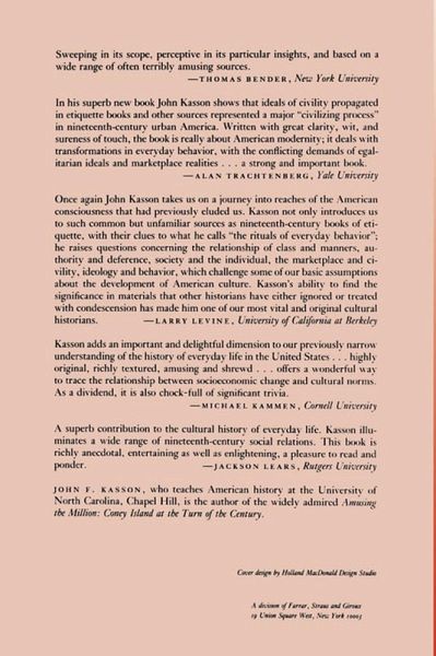 With keen insight and subtle humor, John F. Kasson explores the history and politics of etiquette from America's colonial times through the nineteenth century. He describes the transformation of our notion of "gentility," once considered a birthright to some, and the development of etiquette as a middle-class response to the new urban and industrial economy and to the excesses of democratic society.