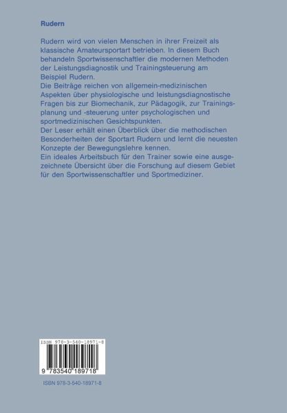 Rudern wird von vielen Menschen in ihrer Freizeit als klassische Amateursportart betrieben. In diesem Buch behandeln Sportwissenschaftler die modernen Methoden der Leistungsdiagnostik und Trainingssteuerung am Beispiel Rudern. Die Beiträge reichen von allgemein-medizinischen Aspekten über physiologische und leistungsdiagnostische Fragen bis zur Biomechanik, zur Pädagogik, zur Trainingsplanung und -steuerung unter psychologischen und sportmedizinischen Gesichtspunkten. Der Leser erhält einen Überblick über die methodischen Besonderheiten der Sportart Rudern und lernt die neuesten Konzepte der Bewegungslehre kennen. Ein ideales Arbeitsbuch für den Trainer sowie eine ausgezeichnete Übersicht über die Forschung auf diesem Gebiet für den Sportwissenschaftler und Sportmediziner.