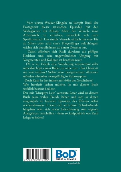 Vom ersten Wecker-Klingeln an kämpft Rudi, der Protagonist dieser satirischen Episoden mit den Widrigkeiten des Alltags. Allein der Versuch, seine Arbeitsstelle zu erreichen, entwickelt sich zum Spießrutenlauf. Der simple Versuch, einfach nur eine Tür zu öffnen oder auch einen Fliegenfänger aufzuhängen, wächst sich unaufhaltsam zu einem Desaster aus. Dabei offenbart sich Rudi durchaus als pfiffiges Kerlchen und sein ungewöhnlicher Umgang mit Vorgesetzten und Kollegen ist beachtenswert. Ob er im Urlaub eine Wanderung unternimmt oder unbeabsichtigt einem Bullen zu nahe tritt - das Chaos ist nie weit entfernt! Selbst seine bestgemeinten Aktionen münden scheinbar zwangsläufig in Katastrophen. Doch Rudi ist fast immer auf Höhe des Geschehens! Wer herzhaft lachen möchte, ist mit diesem Buch wirklich bestens bedient.Der mit "Murphys Law" vertraute Leser wird an diesem Buch seine wahre Freude haben und sich in diesen vergnüglich zu lesenden Episoden des Öfteren selbst wiedererkennen. Er kann sich auch purer Schadenfreude hingeben oder sich etwas Erleichterung vom eigenen Alltagsfrust verschaffen - denn so knüppeldick wie Rudi kriegt es keiner!