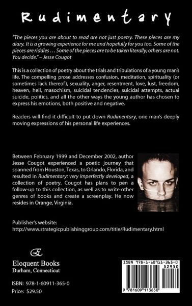 "The pieces you are about to read are not just poetry. These pieces are my diary. It is a growing experience for me and hopefully for you too. Some of the pieces are riddles ... Some of the pieces are to be taken literally; others are not. You decide." - Jesse Cougot This is a collection of poetry about the trials and tribulations of a young man's life. The compelling prose addresses confusion, meditation, spirituality (or sometimes lack thereof), sexuality, anger, resentment, love, lust, freedom, heaven, hell, masochism, suicidal tendencies, suicidal attempts, actual suicide, politics, and all the other ways the young author has chosen to express his emotions, both positive and negative. Readers will find it difficult to put down Rudimentary, one man's deeply moving expressions of his personal life experiences. About the Author: Between February 1999 and December 2002, author Jesse Cougot experienced a poetic journey that spanned from Houston to Orlando, Florida, and resulted in Rudimentary: very imperfectly developed, a collection of poetry. Cougot has plans to pen a follow-up to this collection, as well as to write other genres of books and create a screenplay. He now resides in Houston, TX. https://www.facebook.com/trademarkedbyjesse