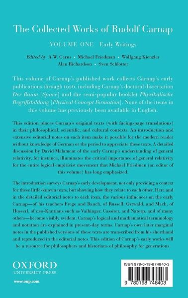 This volume is the first of a complete edition of the writings of Rudolf Carnap. Translated into English for the first time and supplemented with a detailed introduction, Carnap's early works are contextualised in extensive notes and critically discussed by an international team of scholars who specialize in different aspects of Carnap's thought.