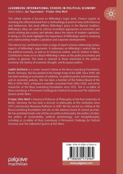 1. Introduction: Critically Returning to Rudolf Hilferding.- 2. Rethinking Hilferding's Finance Capital.- 3. From Luxemburg to Sweezy. Notes on the Intellectual Influence of Hilferding's Finance Capital.- 4. Contradictions in Hilferding's Finance Capital: Money, Banking and Crisis Tendencies.- Chapter 5: Finance Capital, Financialisation and the Periodisation of Capitalist Development.- 6. A New Finance Capital? Theorizing Corporate Governance and Financial Power.- 7. Finance Capital and Contemporary Financialisation.- 8. Finance Capital and Militarism as Pillars of Contemporary Capitalism.- 9. Hilferding and the Large-scale Enterprise.- 10. Hilferding and Kalecki.- 11. A Socialist Third Way? Rudolf Hilferding's Evolutionary Socialism as Syncopated Note to Early Neoliberalism.- 12. Hilferding as an Eclectic: A History of Economic Thought Perspective on Finance Capital (1910).- 13. Rudolf Hilferding on the Economic Categories of 'Joint-Stock Company/Share Capital': A Refinement ofthe Critique of Political Economy?.- 14. Hilferding's Impressive Failure. A Reading of His Last Major Text.