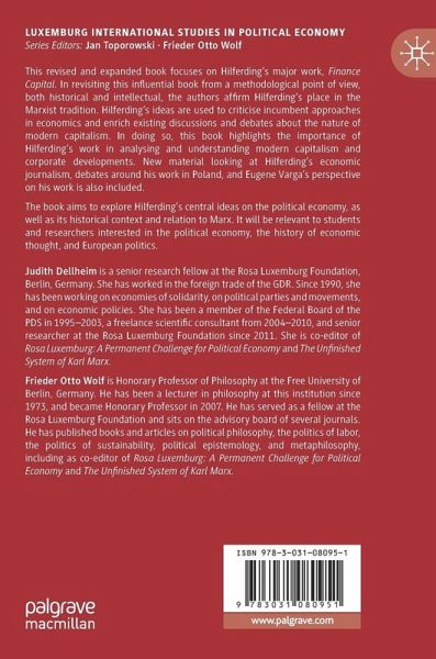 This revised and expanded book focuses on Hilferding's major work, Finance Capital. In revisiting this influential book from a methodological point of view, both historical and intellectual, the authors affirm Hilferding's place in the Marxist tradition. Hilferding's ideas are used to criticise incumbent approaches in economics and enrich existing discussions and debates about the nature of modern capitalism. In doing so, this book highlights the importance of Hilferding's work in analysing and understanding modern capitalism and corporate developments. New material looking at Hilferding's economic journalism, debates around his work in Poland, and Eugene Varga's perspective on his work is also included.The book aims to explore Hilferding's central ideas on the political economy, as well as its historical context and relation to Marx. It will be relevant to students and researchers interested in the political economy, the history of economic thought, and European politics.