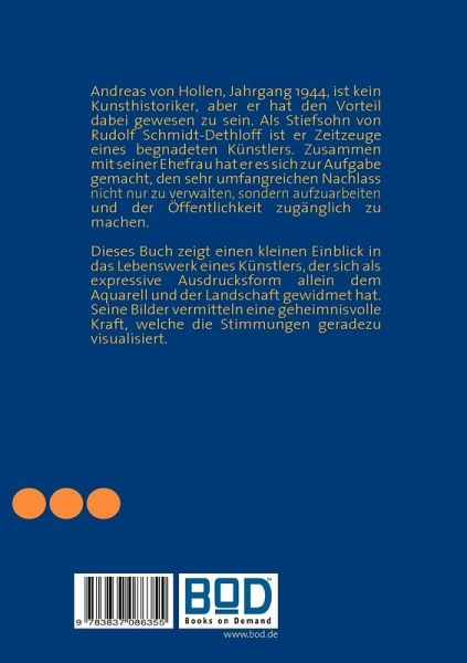 Rudolf Schmidt-Dethloff wurde am 28.09.1900 in Rostock geboren und verstarb am 12.06.1971 in Lindau/Bodensee. Erst über 30 Jahre nach seinem Tod begann sein Stiefsohn mit der Aufarbeitung des Nachlasses. So soll dieses Buch dazu dienen, diesen Meister der Aquarellkunst und seine Werke einer breiten Öffentlichkeit zugänglich zu machen. Dieses Buch zeigt einen kleinen Einblick in das Lebenswerk eines Künstlers, der sich als expressive Ausdrucksform allein dem Aquarell und der Landschaft gewidmet hat. Seine Bilder aus Ahrenshoop, Berlin, Baden-Württemberg, Bodensee, Österreich und Italien vermittlen eine geheimnisvolle Kraft, welche die Stimmungen geradezu visualisiert.
