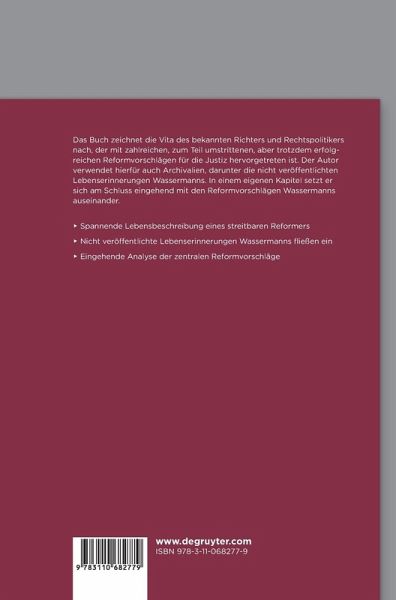 Das Buch zeichnet die Vita des bekannten Richters und Rechtspolitikers nach, der mit zahlreichen, zum Teil umstrittenen, aber trotzdem erfolgreichen Reformvorschlägen für die Justiz hervorgetreten ist. Der Autor verwendet hierfür auch Archivalien, darunter die nicht veröffentlichten Lebenserinnerungen Wassermanns. In einem eigenen Kapitel setzt er sich am Schluss eingehend mit den Reformvorschlägen Wassermanns auseinander.