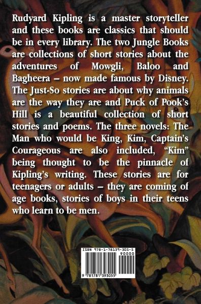 Rudyard Kipling is a master storyteller and these books are classics that should be in every library. The two Jungle Books are collections of short stories about the adventures of Mowgli, Baloo and Bagheera - now made famous by Disney. The Just-So stories are about why animals are the way they are and Puck of Pook's Hill is a beautiful collection of short stories and poems. The three novels: The Man who would be King, Kim, Captain's Courageous are also included, "Kim" being thought to be the pinnacle of Kipling's writing. These stories are for teenagers or adults - they are coming of age books, stories of boys in their teens who learn to be men.
